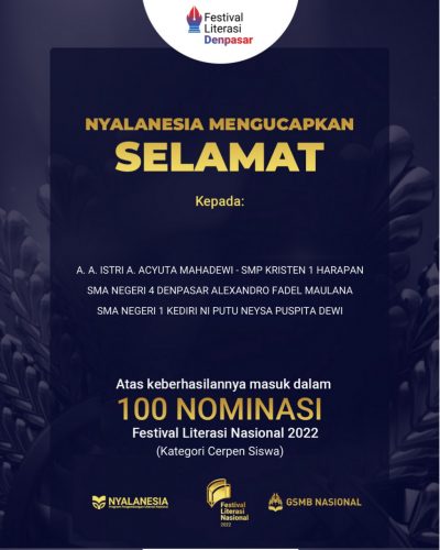 • Masuk dalam 100 Nominasi Festival Literasi Nasional 2022 Kategori Cerpen Siswa (A. A. Istri A. Acyuta Mahadewi)