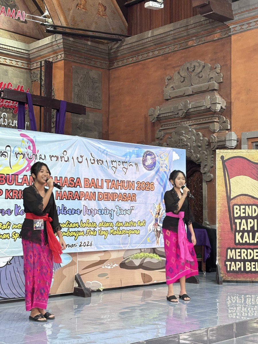 DENPASAR – Semangat pelestarian budaya Bali bergelora di lingkungan SMP Kristen 1 Harapan. Dalam rangka menyambut Bulan Bahasa Bali, sekolah yang dikenal dengan keberagamannya ini menyelenggarakan serangkaian perlombaan antar kelas yang meriah dan penuh antusiasme dari para siswa. Perayaan tahun ini mengusung tema sentral “Artha Kerthi: Udiara Purnaning Jiwa”, yang bermakna penyucian jiwa melalui taman keilmuan dan sastra.