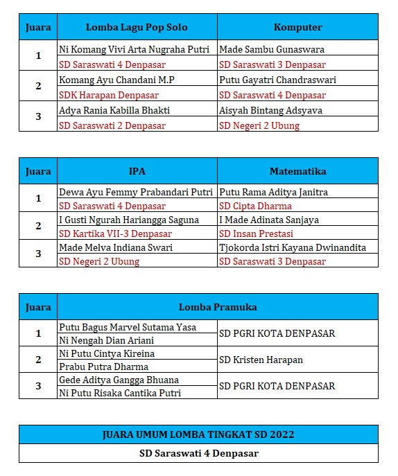 Berikut ini adalah perolehan juara masing-masing lomba.