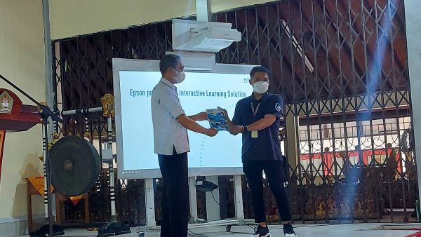 Kegiatan workshop ini diakhiri dengan penyerahan Epson Interactive Projector kepada wakil dari Disdikpora kota Denpasar, Bapak Anak Agung Putu Gede Astara, ST.